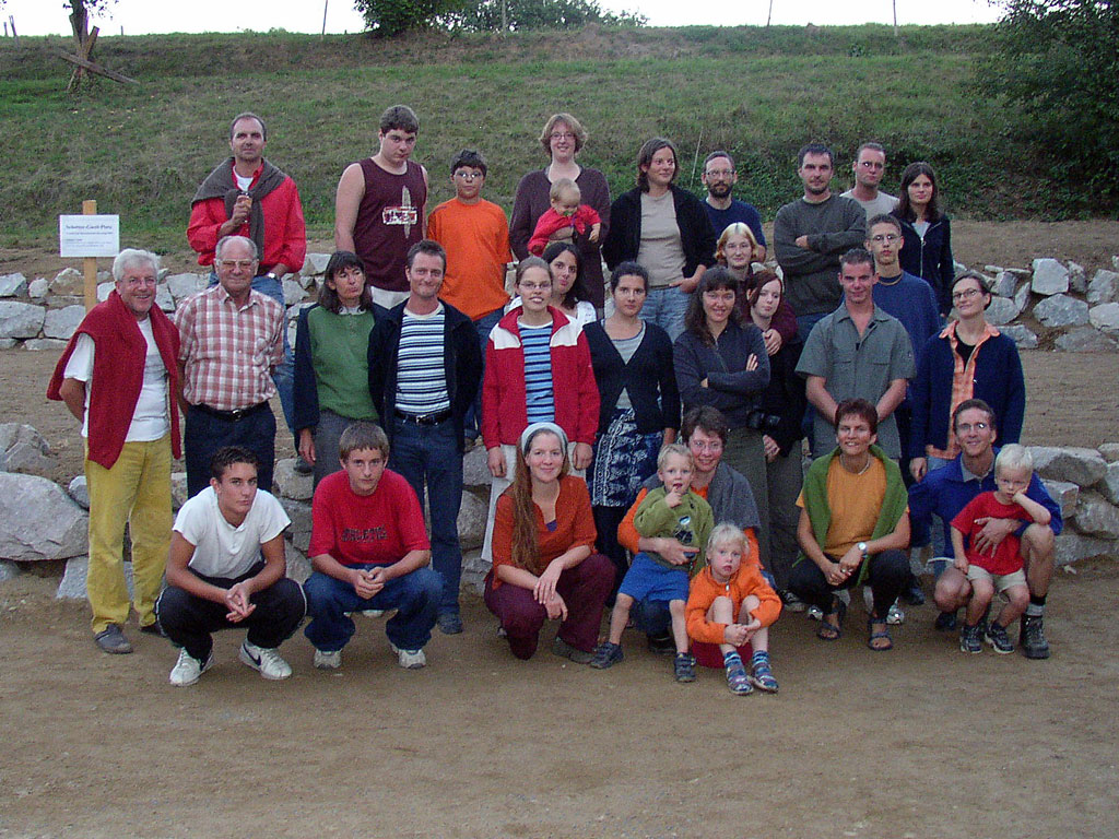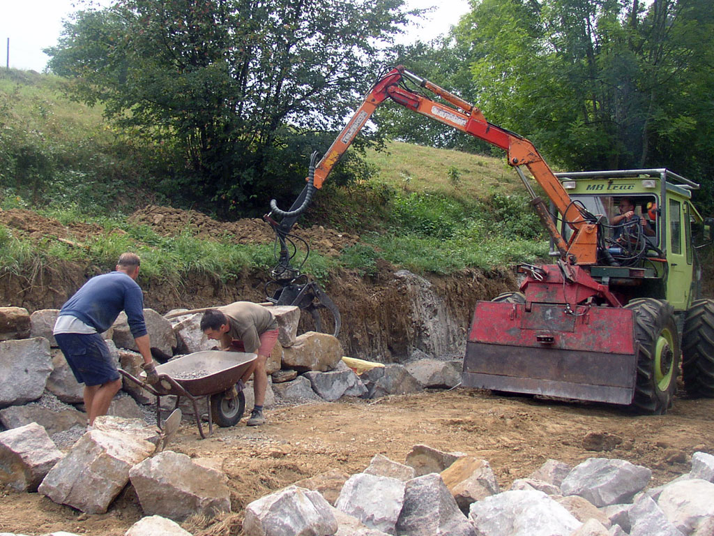 2002/2003 können wir das Grundstück erweitern und haben so die Möglichkeit eine weitere Zeltplatzfläche zu schaffen. Harald Friedrich erstellt die Planung für den Bauantrag, der nach einigen Hürden dann schließlich genehmigt wurde. Im Rahmen des Internationalen Baucamps 2003 haben wir den Zeltplatz auf der anderen Seite des Baches gebaut! Von Hand und ohne Hilfe von Gustav Geiger mit seinem Bagger und dem Holzladegreifer von Karlfrieder Müller aus Hasel wäre das nicht möglich gewesen. Das schwere Gerät und die Tatkraft der beiden hilft uns die Hangmauer und die Platzanlage fertig zu stellen.